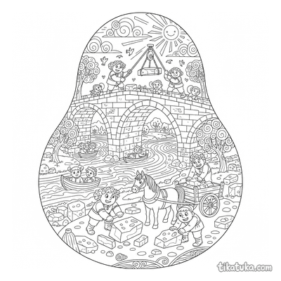 Esta coleção reúne desenhos de construções e estruturas de diferentes partes do mundo: pontes de pedra arqueadas sobre riachos, castelos medievais com pátios floridos e fontes, faróis em penhascos à beira-mar, moinhos de vento em colinas e palácios do deserto com torres imponentes. Cada cena inclui personagens em ação — construtores erguendo arcos, artistas num pátio de castelo, viajantes admirando arquiteturas exóticas ou barqueiros navegando por bairros históricos de canais — o que transforma cada página numa pequena história para imaginar enquanto se colore.