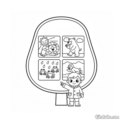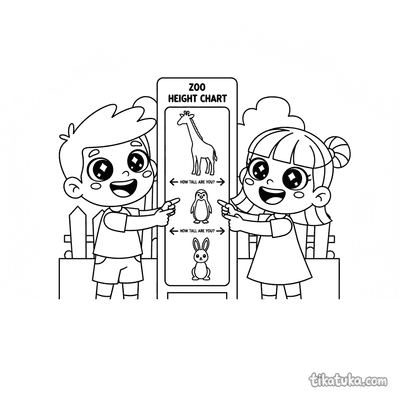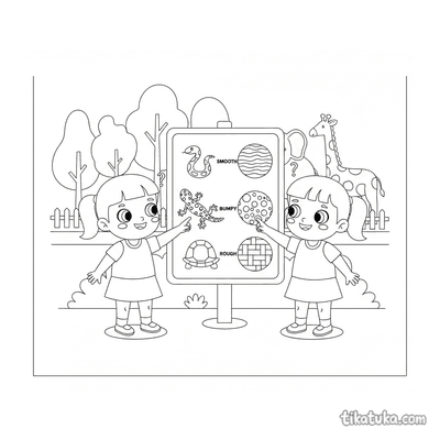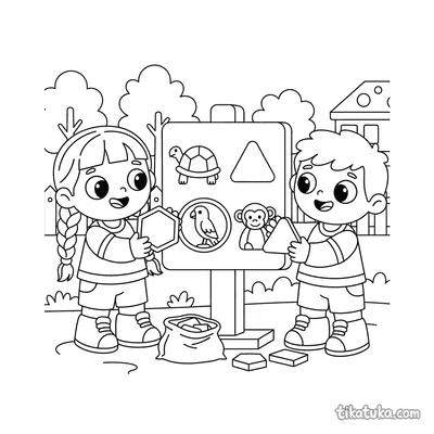 As páginas educativas reúnem ilustrações criadas para estimular a curiosidade das crianças enquanto colorem. Os temas vão da contagem de frutas e objetos do cotidiano ao reconhecimento de formas geométricas com personagens animados, passando por cenas de zoológico onde jovens exploradores descobrem habitats e comportamentos de animais. Cada desenho combina o prazer da atividade gráfica com um elemento claro de aprendizagem visual.