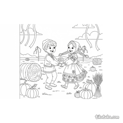 A secção de folclore reúne 152 desenhos para colorir inspirados nas tradições populares da Europa de Leste, do Japão e de outras culturas do mundo. Cada página retrata uma cena específica — um músico da aldeia a tocar gusli sob uma árvore, uma família a construir um monte de feno, um duende a ajudar o padeiro, uma menina a desfilar com um espantalho — tornando cada desenho uma pequena janela para um universo de lendas e costumes.