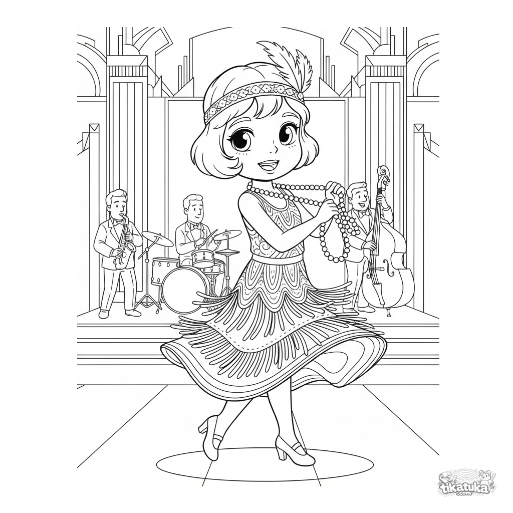 Página para colorir para meninas 10-12: uma garota em um vestido flapper detalhado dos anos 20 com franja de miçangas gira alegremente em um grande salão art deco.