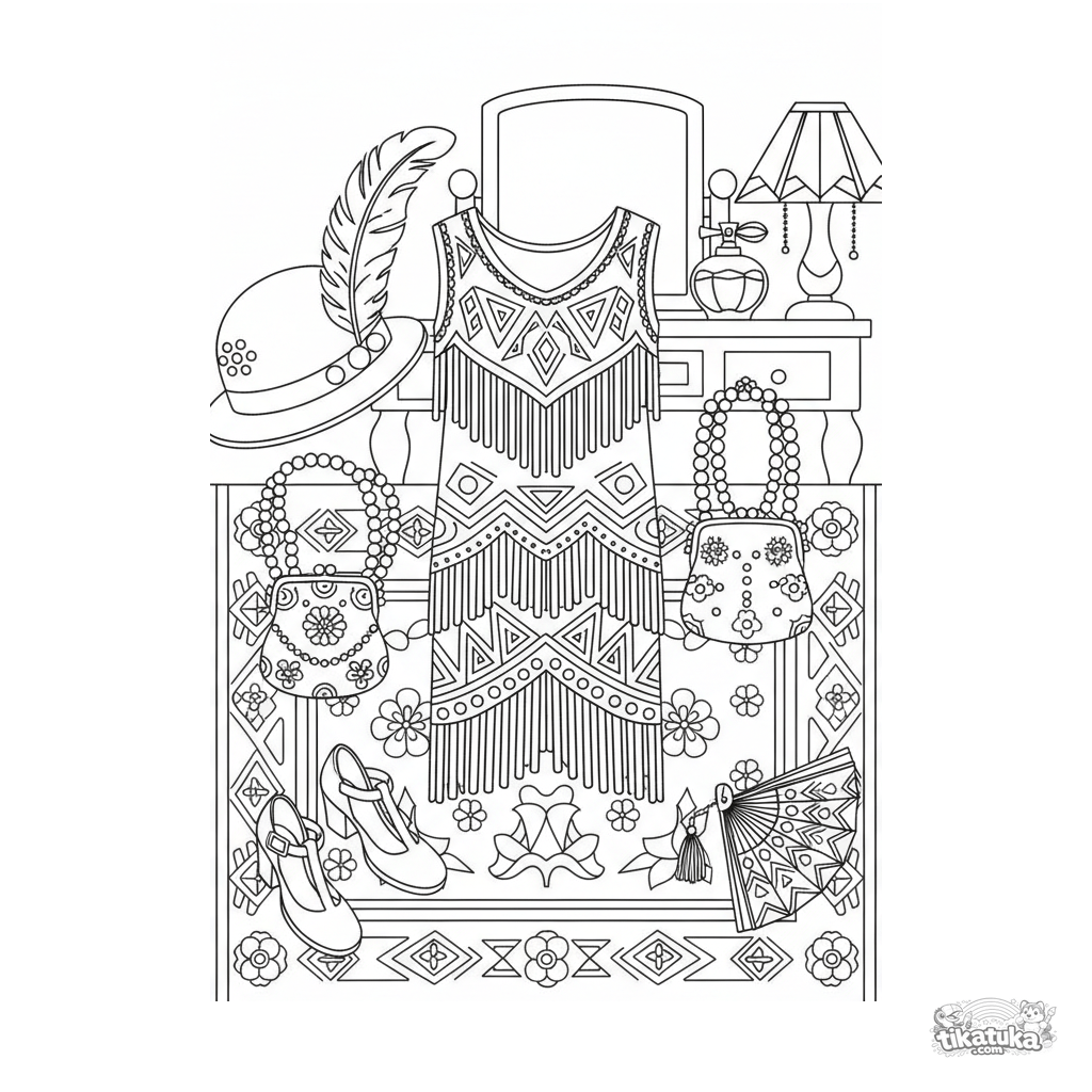 Página para colorir detalhada para meninas 10-12: traje completo de flapper dos anos 20 em um quarto vintage. Múltiplos acessórios, padrões e texturas.