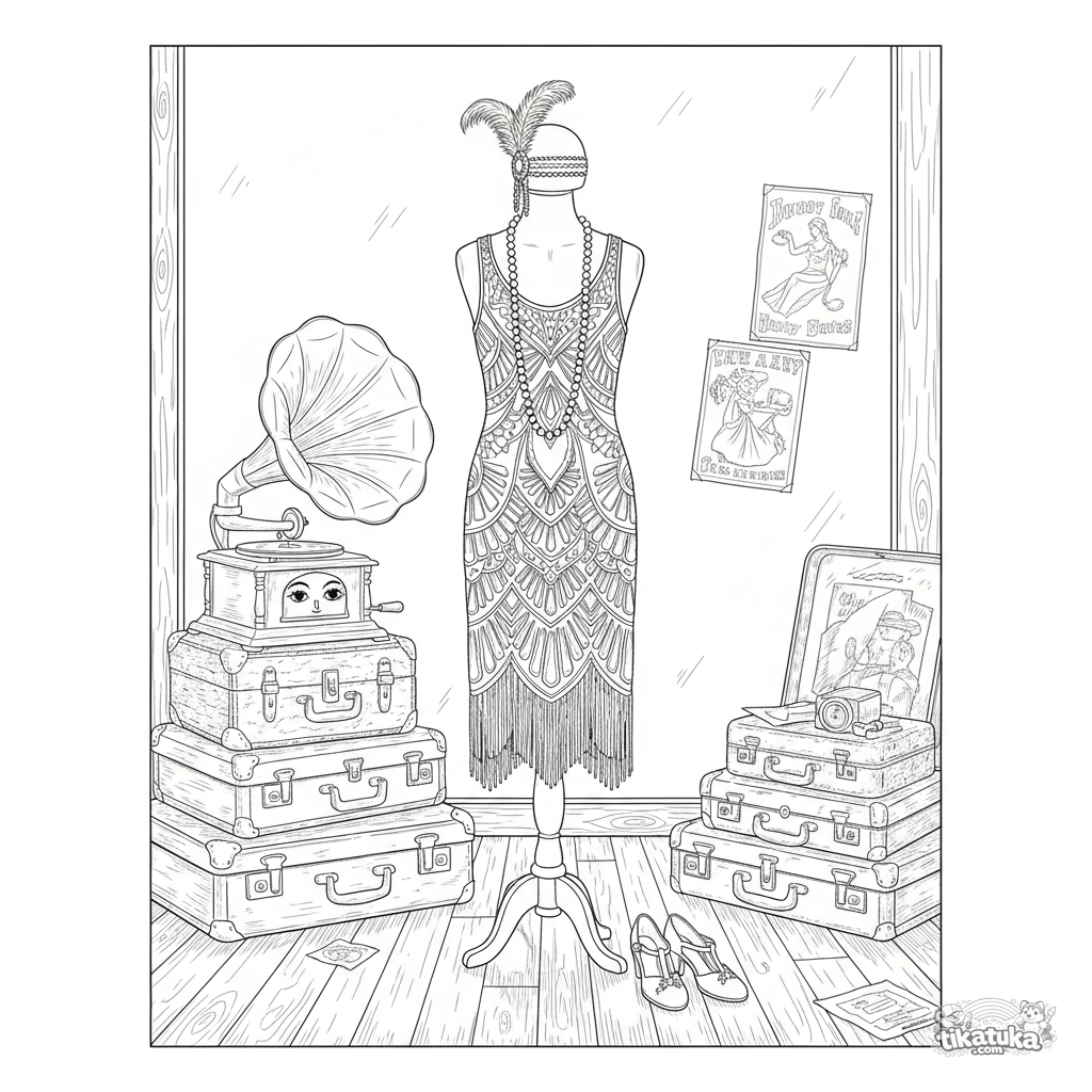 Página complexa para colorir para 10-12 anos: um vestido flapper vintage dos anos 20 em um manequim de loja de antiguidades. Cena detalhada com miçangas, penas e gramofone.
