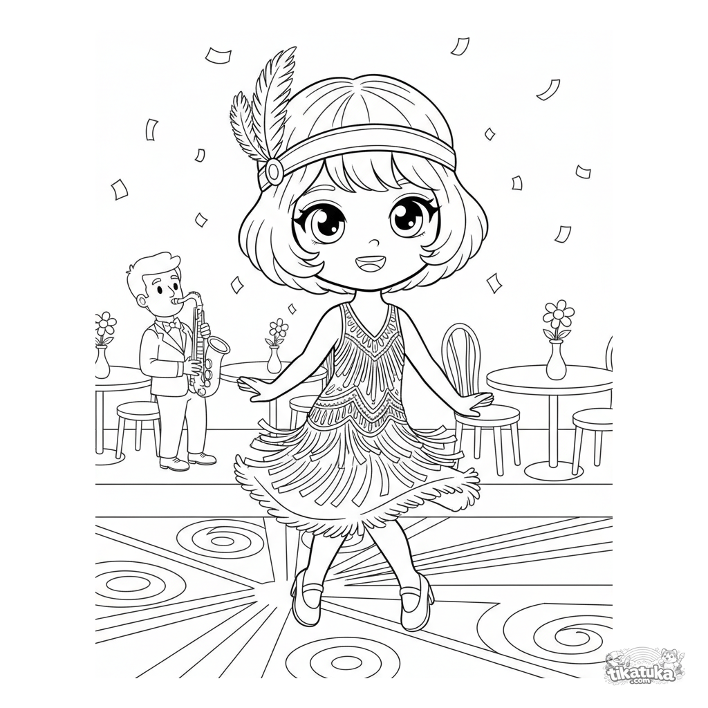 Página para colorir para meninas 10-12: uma garota em um vestido flapper dos anos 20 gira alegremente na pista de dança de um speakeasy.
