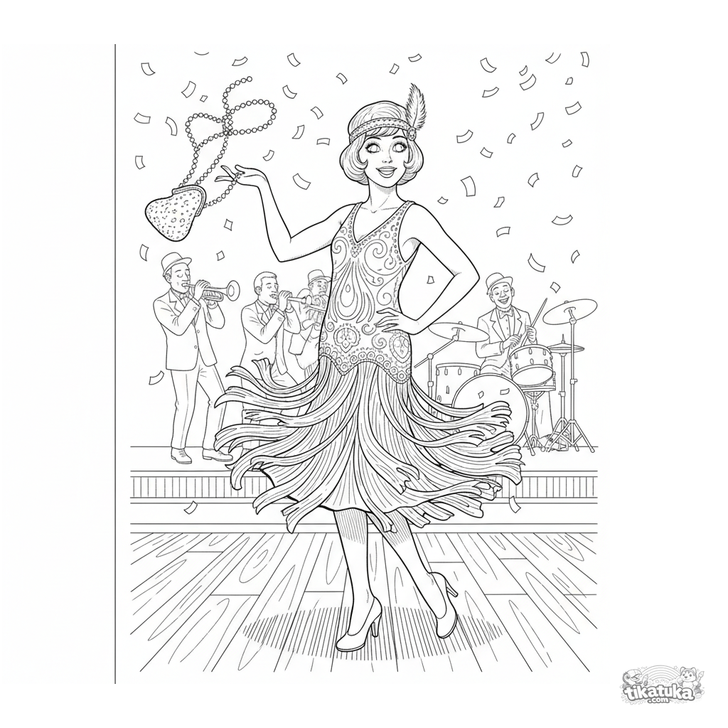 Página para colorir complexa para 10-12 anos: garota em vestido flapper dos anos 20 girando na pista de dança secreta. Cena dinâmica com banda, confete e detalhes históricos.