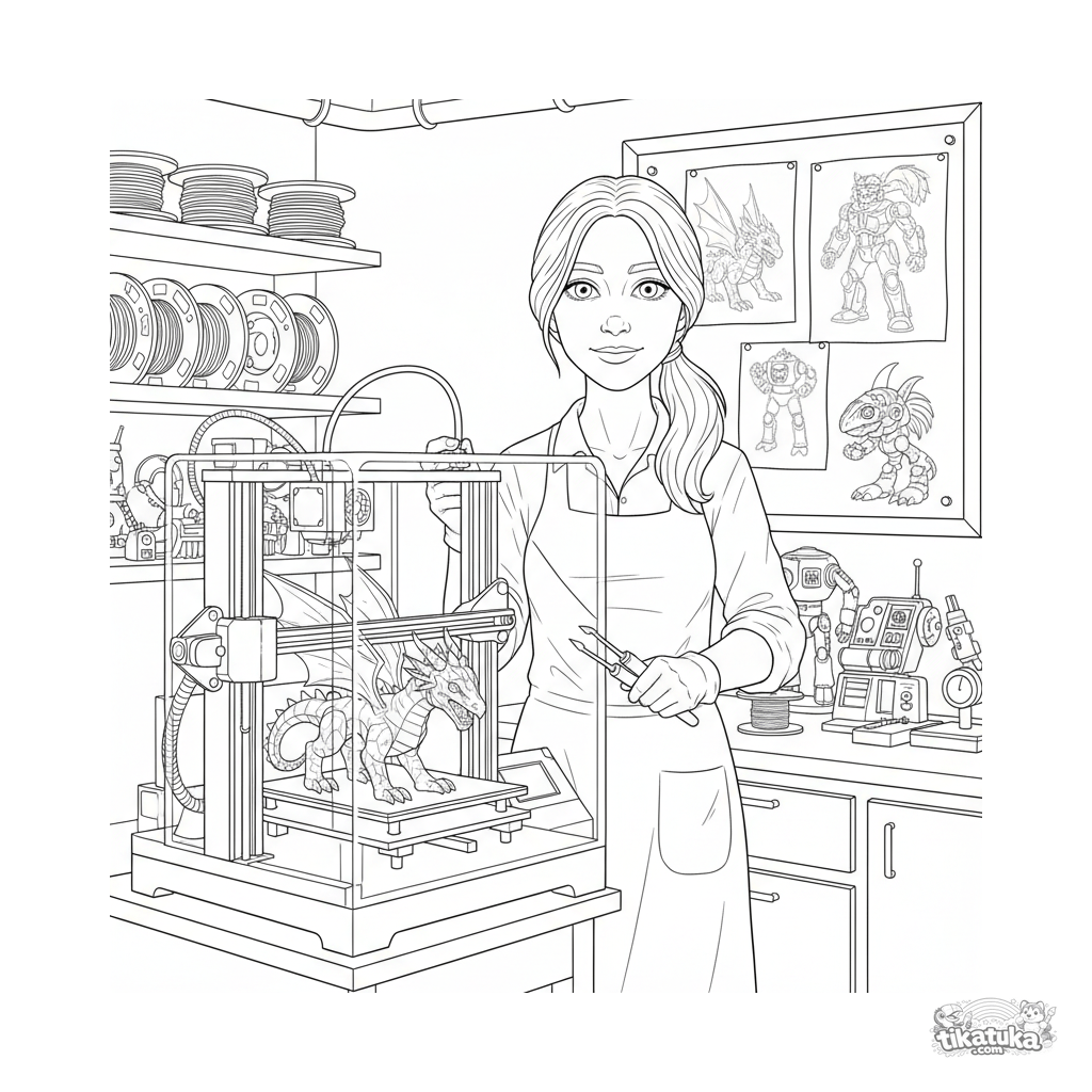 Página para colorir detalhada: um entusiasta de impressão 3D observa uma impressora em um laboratório no porão. Muitos objetos: filamentos, modelos.