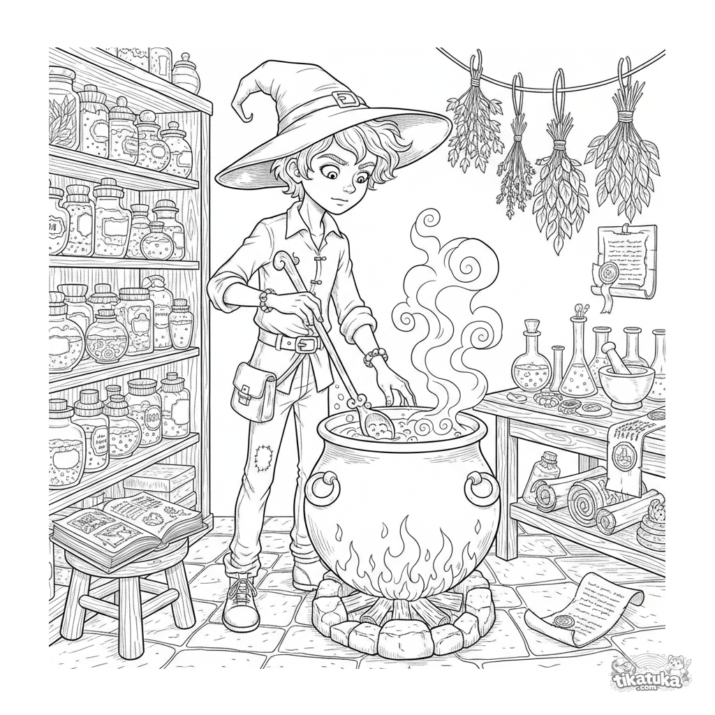 Página para colorir para crianças 10-12: um aprendiz de alquimia prepara uma poção em uma oficina desordenada. Cena detalhada no estilo de gravura vintage, muitos objetos, margens amplas.