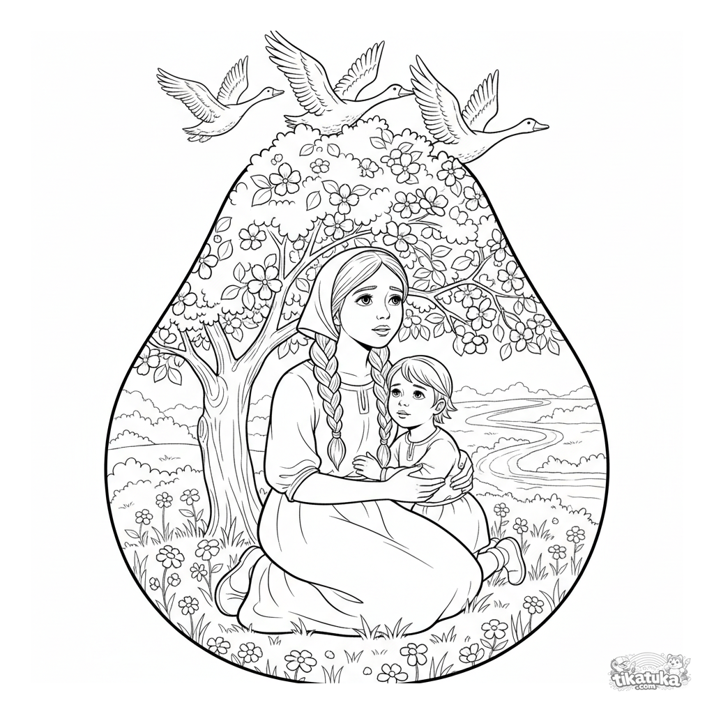 Página para colorir de 'Gansos-cisnes': Alyonushka se escondendo com o irmão sob uma macieira. Para 5-9 anos. Cena na floresta com gansos voando.