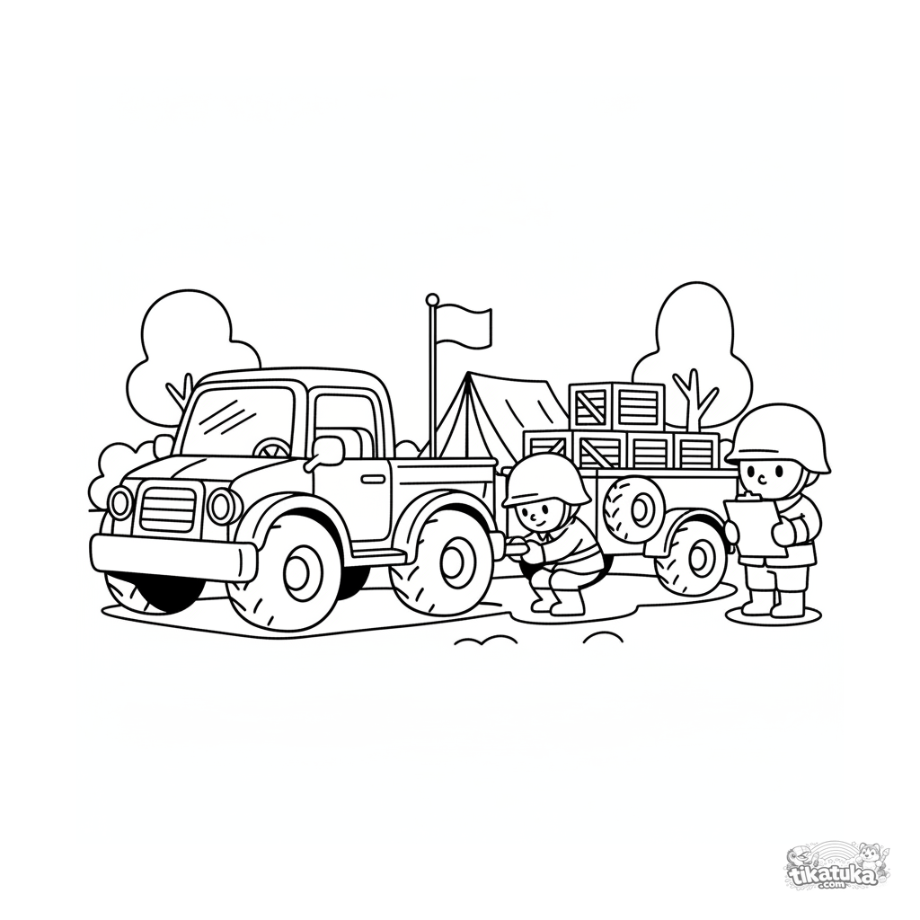 Página para colorir para crianças de 4-6 anos: soldados engatam um reboque de munição a um veículo perto do quartel-general de campo. Proporções divertidas, estilo cartoon dos anos 90.