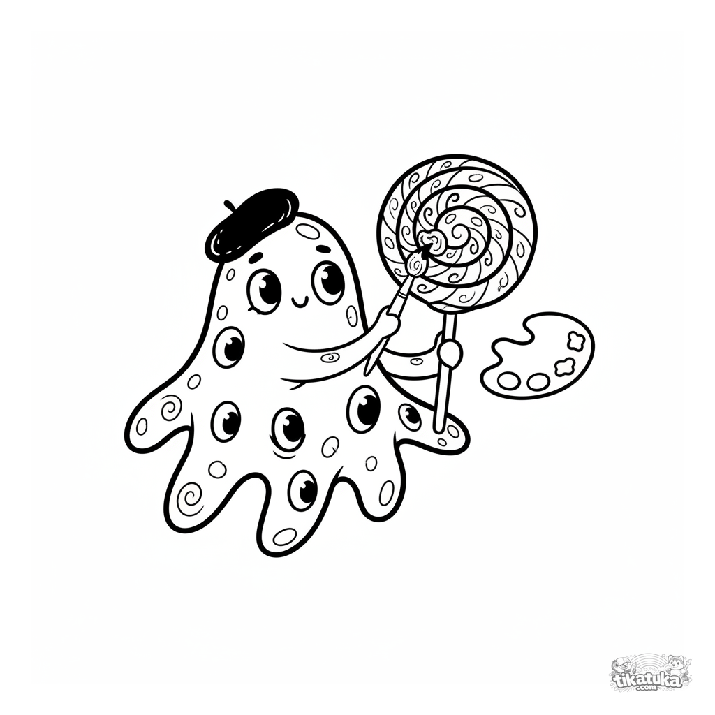 Página para colorir para crianças maiores 10-12: um micróbio pintor em forma de ameba decora um pirulito. Cena detalhada com paleta e pincéis.