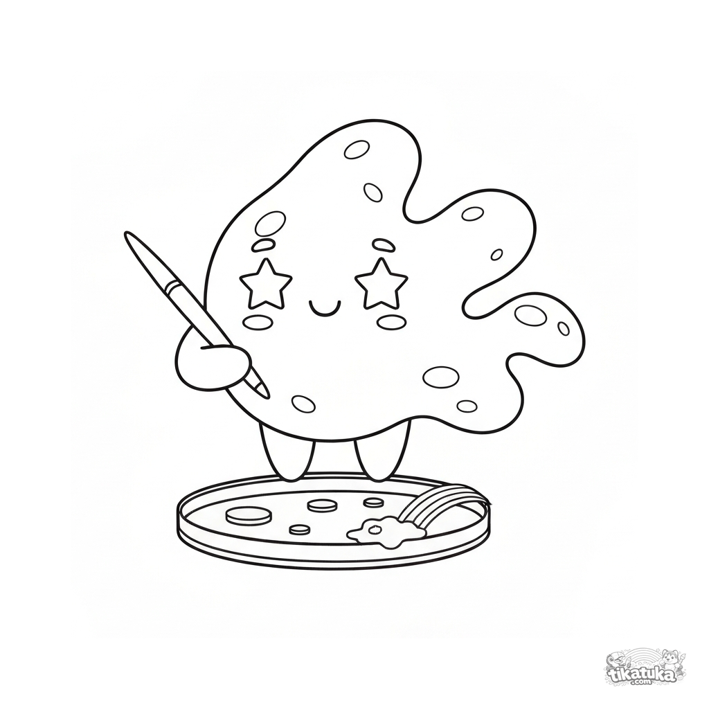 Página para colorir para crianças. Ameba fofa com pincel pintando arco-íris em placa de Petri. Olhos estrelados e pseudópodes ondulados. Download grátis.