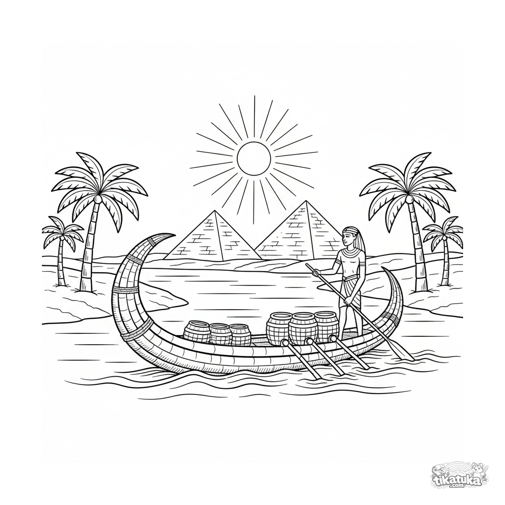 Página para colorir para pré-adolescentes 7-9: um antigo barco de papiro egípcio navega no Nilo. Pirâmides, palmeiras e detalhes históricos criam uma cena educativa para colorir.