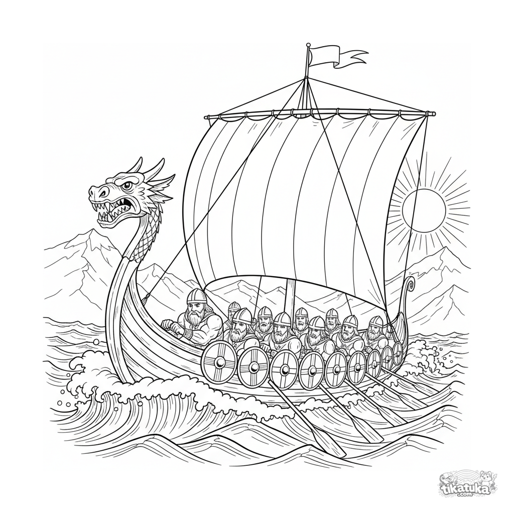 Página para colorir para pré-adolescentes 7-9: um navio viking com proa de dragão navega em mar agitado. Guerreiros remam, escudos nas laterais. Cena dinâmica de aventura.