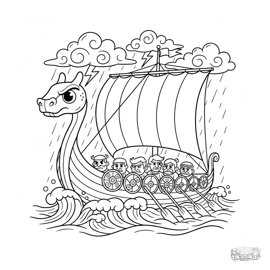 Página para colorir para pré-adolescentes 7-9: um navio viking feroz navega em um mar tempestuoso. Cena dinâmica com escudos e ondas.