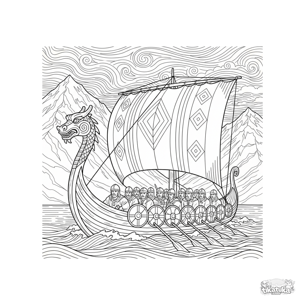Página para colorir detalhada para crianças mais velhas de 10 a 12 anos: um navio viking com proa de dragão e escudos corta as ondas de um fiorde.