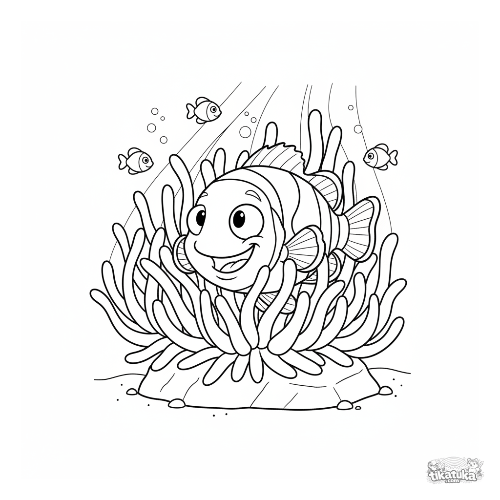 Página para colorir para pré-adolescentes 7-9: um peixe-palhaço brincalhão move-se entre os tentáculos de uma anêmona em águas rasas iluminadas.