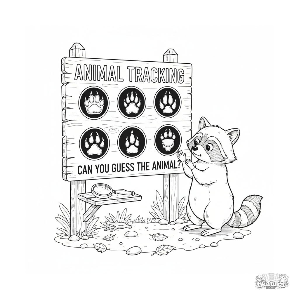 Página para colorir para crianças de 10-12 anos: uma placa detalhada de pegadas de animais no zoológico. Um guaxinim curioso estuda as impressões. Cena educativa.
