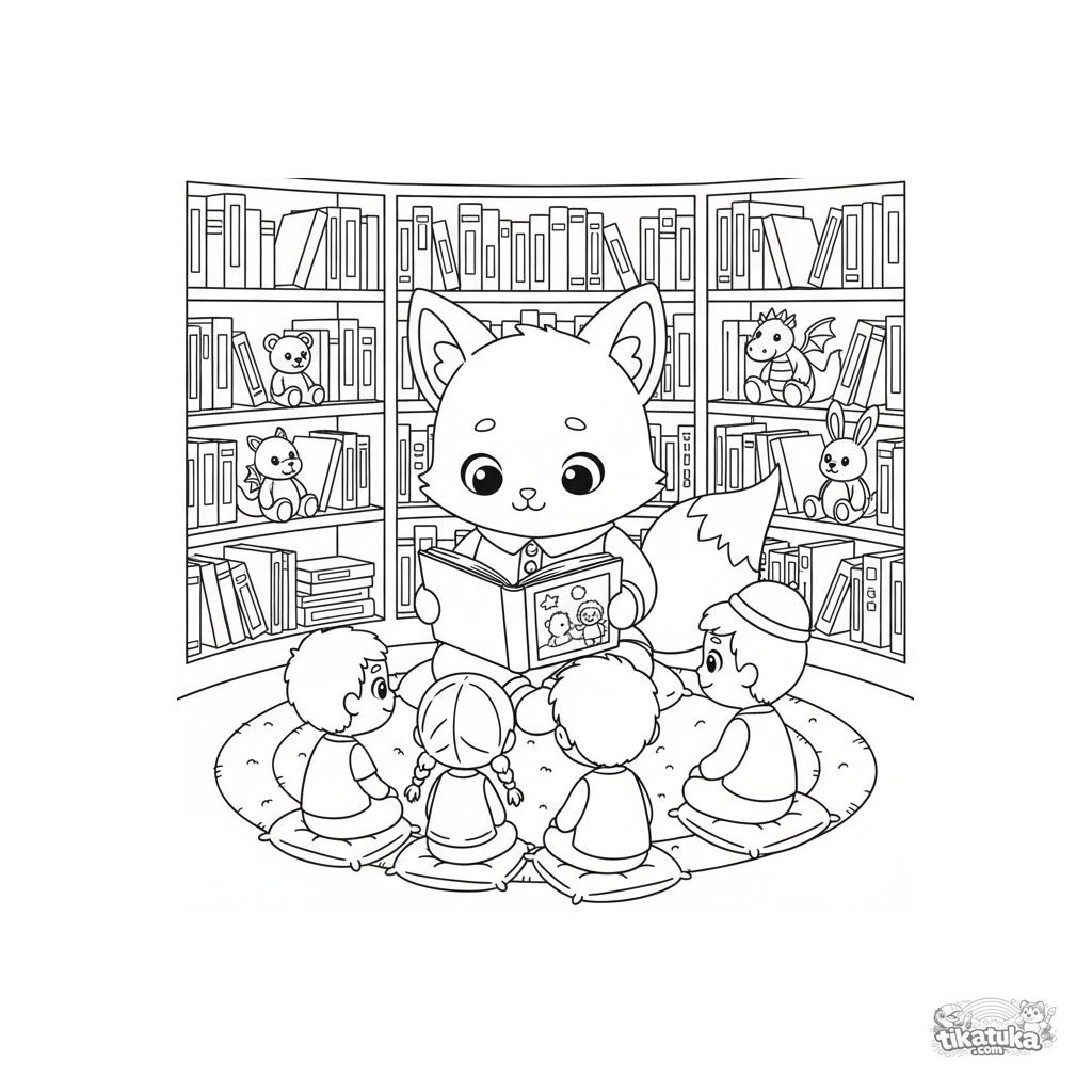 Página para colorir de um super-herói animal com traços de raposa lendo um livro para crianças. Para crianças de 4 a 6 anos.
