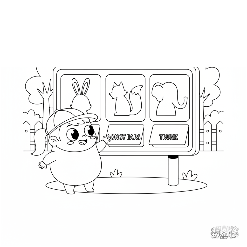 Página para colorir para crianças 4-6: uma criança joga 'Adivinhe o animal pela silhueta' em um painel interativo do zoológico. Cena educativa e cativante para desenvolver habilidades de observação.