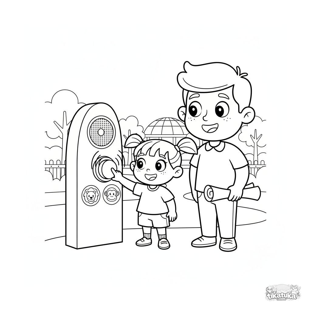Página para colorir para crianças 4-6: uma criança pressiona um botão em uma placa de áudio do zoológico para ouvir sons de leão, macaco e coruja. Aprendizado interativo.