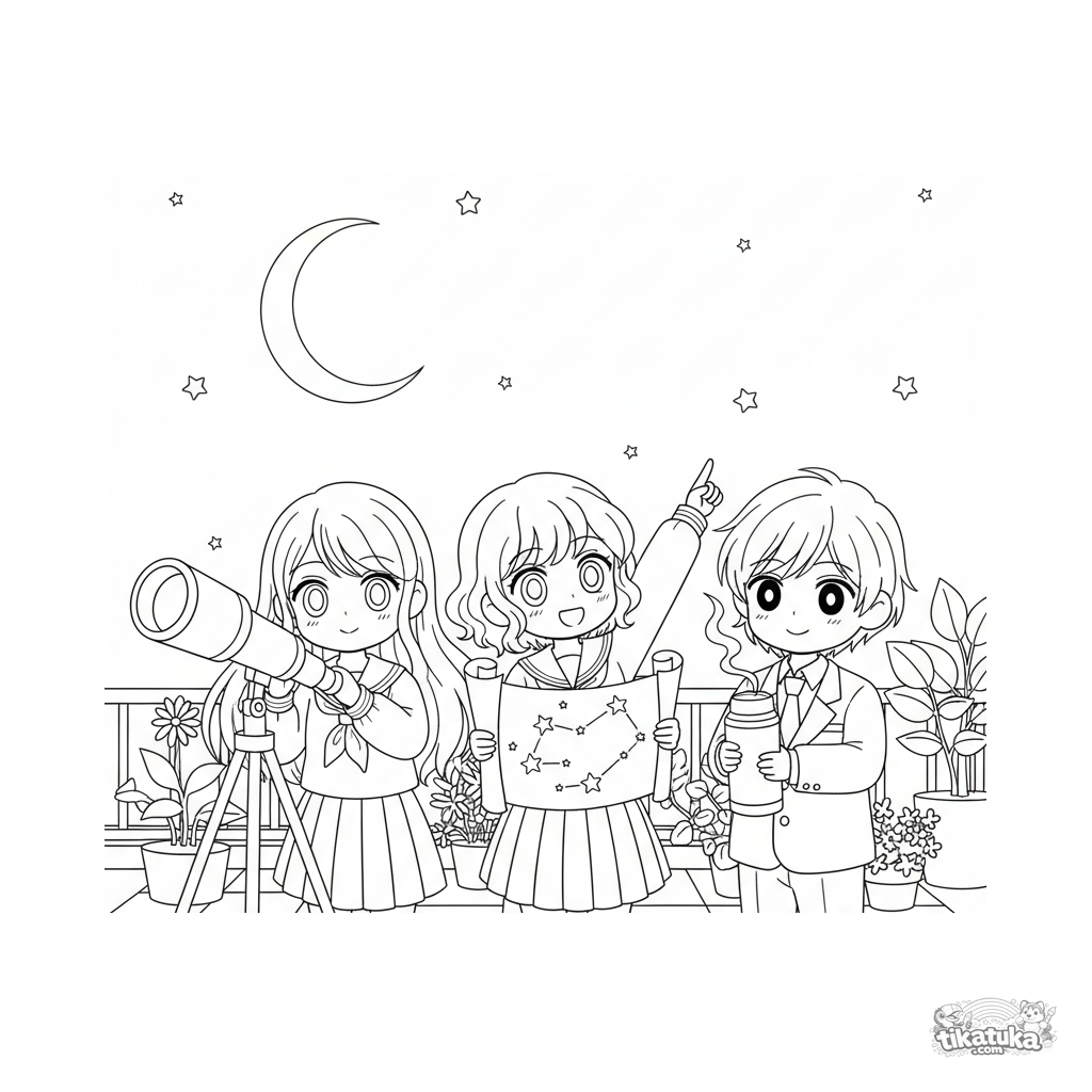 Página para colorir detalhada estilo anime para 10-12 anos: membros do clube de astronomia escolar observam estrelas do telhado ao anoitecer.