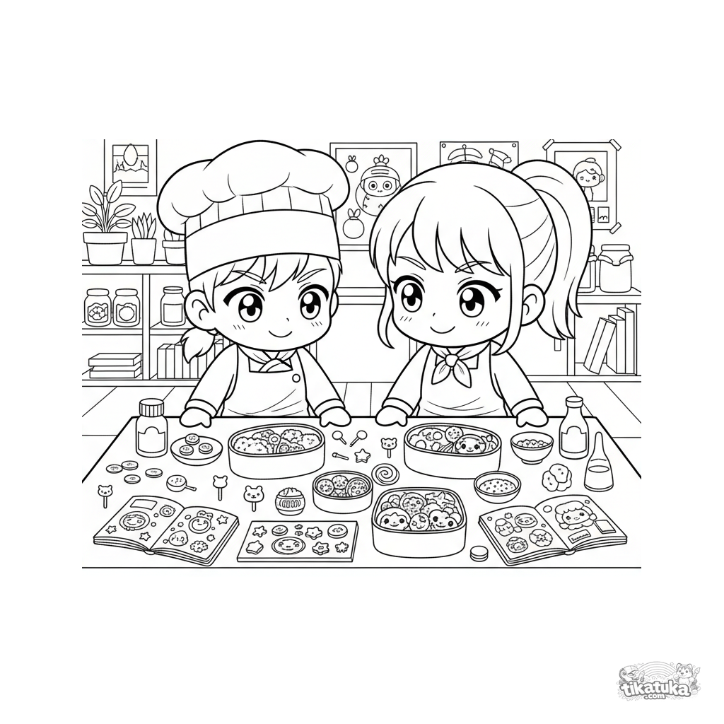 Página para colorir anime: membros de um clube culinário criam marmitas bento artísticas. Cena dinâmica e detalhada para crianças de 10-12 anos.