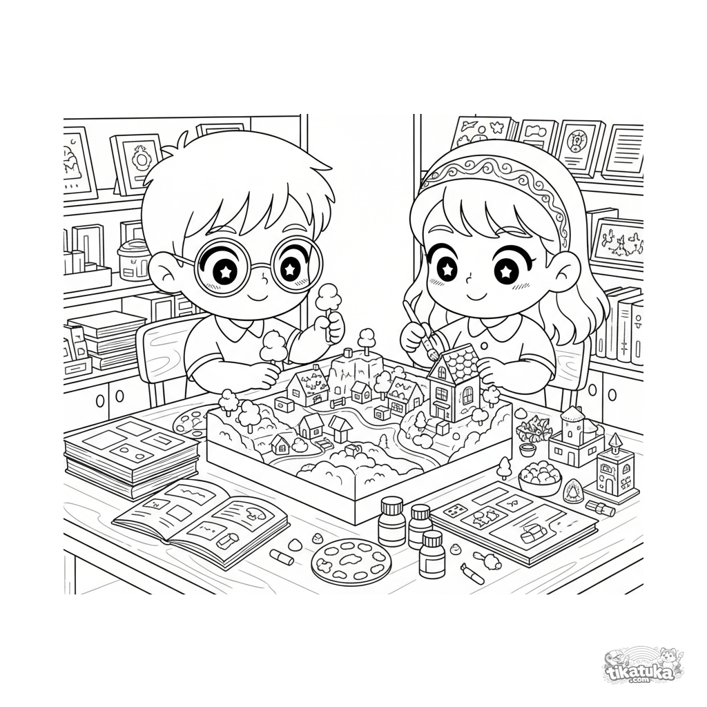Página para colorir estilo anime infantil: dois alunos criam entusiasticamente um diorama em um clube escolar. Cena de alto detalhe para 10-12 anos, com muitos itens pequenos, livros e modelos nas prateleiras.
