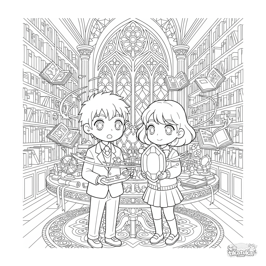 Página para colorir anime complexa: dois amigos exploram uma biblioteca antiga com livros mágicos flutuantes. Cena de interior detalhada para 10-12 anos.
