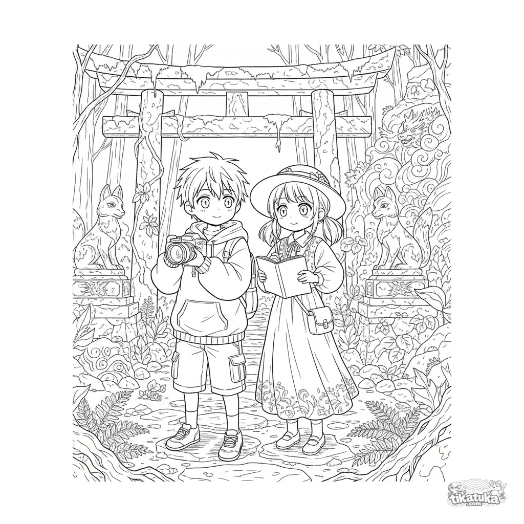 Página para colorir anime kodomo: dois amigos exploram um santuário antigo coberto de vegetação. Cena detalhada com portão torii e estátuas para 10-12 anos.
