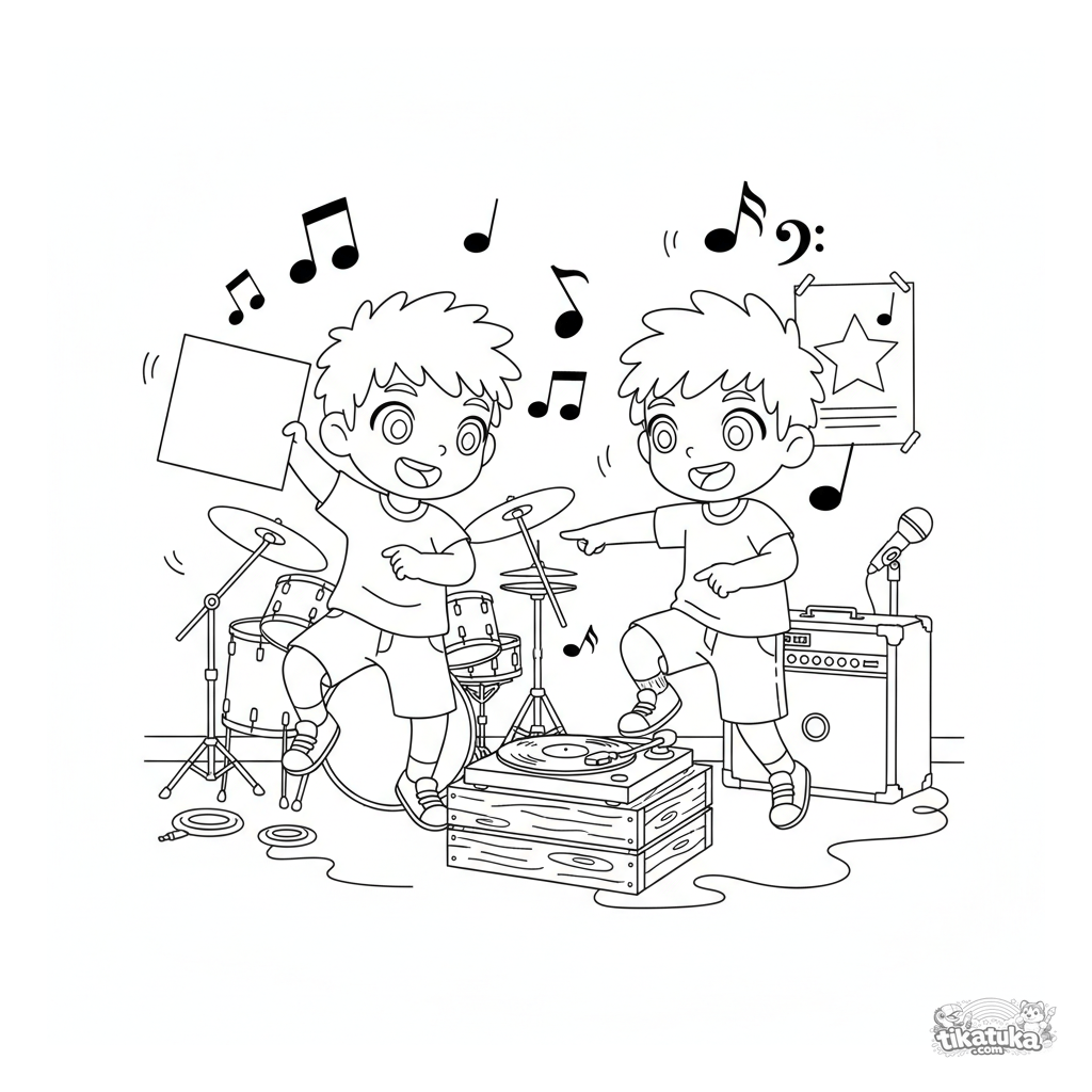 Página para colorir para crianças 6-9 no estilo anime: crianças alegres dançam em uma garagem com um toca-discos de vinil.