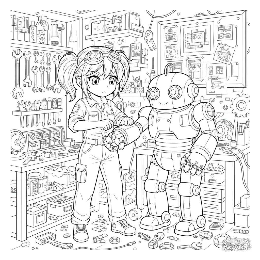 Página para colorir estilo anime para 10-12 anos: uma mecânica conserta um robô grande em uma oficina detalhada cheia de ferramentas e plantas.