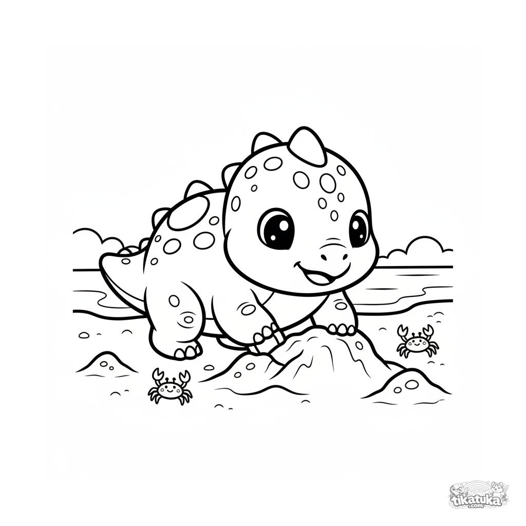 Página para colorir para crianças pequenas de 2-3 anos: um filhote de anquilossauro cava na areia de uma praia oceânica antiga. Formas grandes e simples, margens amplas para colorir.