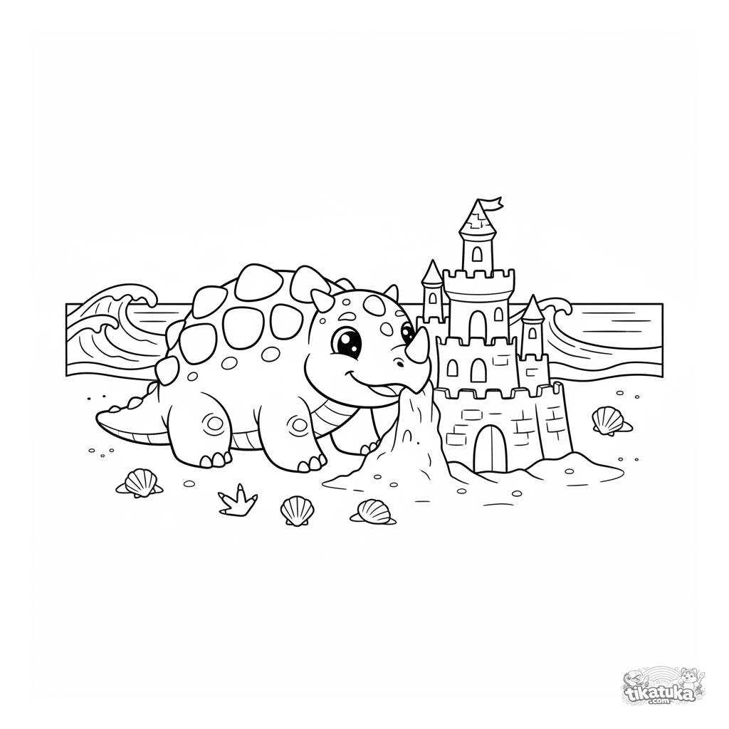 Página para colorir para crianças de 4-6 anos: um anquilossauro construindo um castelo de areia na praia de um oceano antigo.