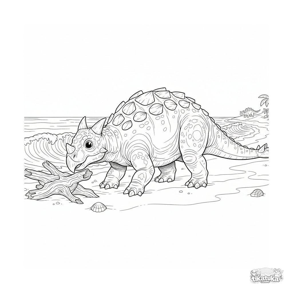 Página para colorir para 10-12 anos: um anquilossauro detalhado explora a praia de um oceano antigo, coletando madeira à deriva.