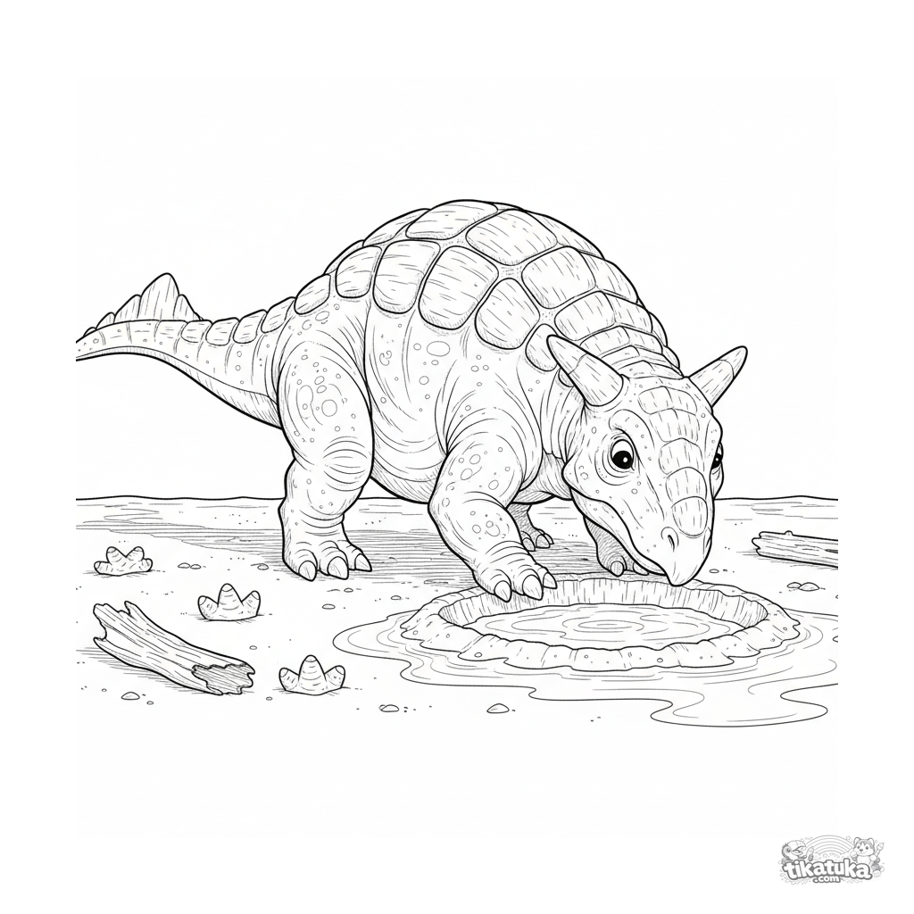 Página para colorir para 10-12 anos: um anquilossauro detalhado cavando um buraco na areia na margem de um oceano antigo. Placas blindadas, clava na cauda.