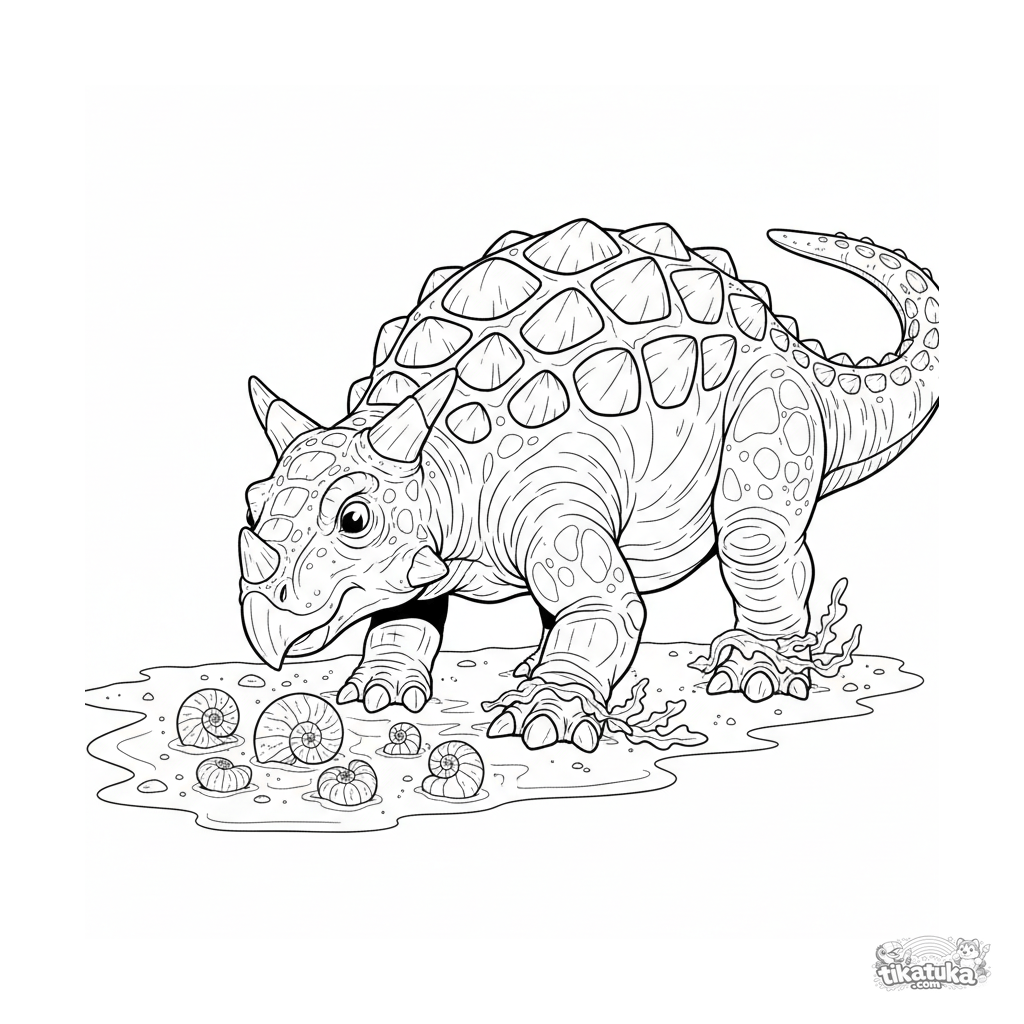 Página para colorir para 10-12 anos: um anquilossauro detalhado cavando em busca de conchas na praia de um oceano antigo.