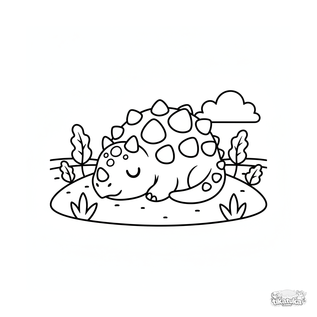 Página para colorir muito simples para bebês 2-3: um anquilossauro cochila em uma duna de areia perto de um oceano antigo. Formas grandes, contornos grossos, detalhes mínimos.