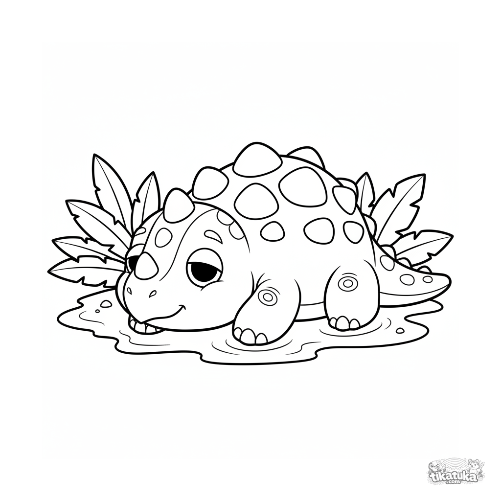 Página simples para colorir para crianças pequenas 2-3: um anquilossauro descansa pacificamente na areia quente de uma praia antiga. Formas grandes, poucos detalhes.