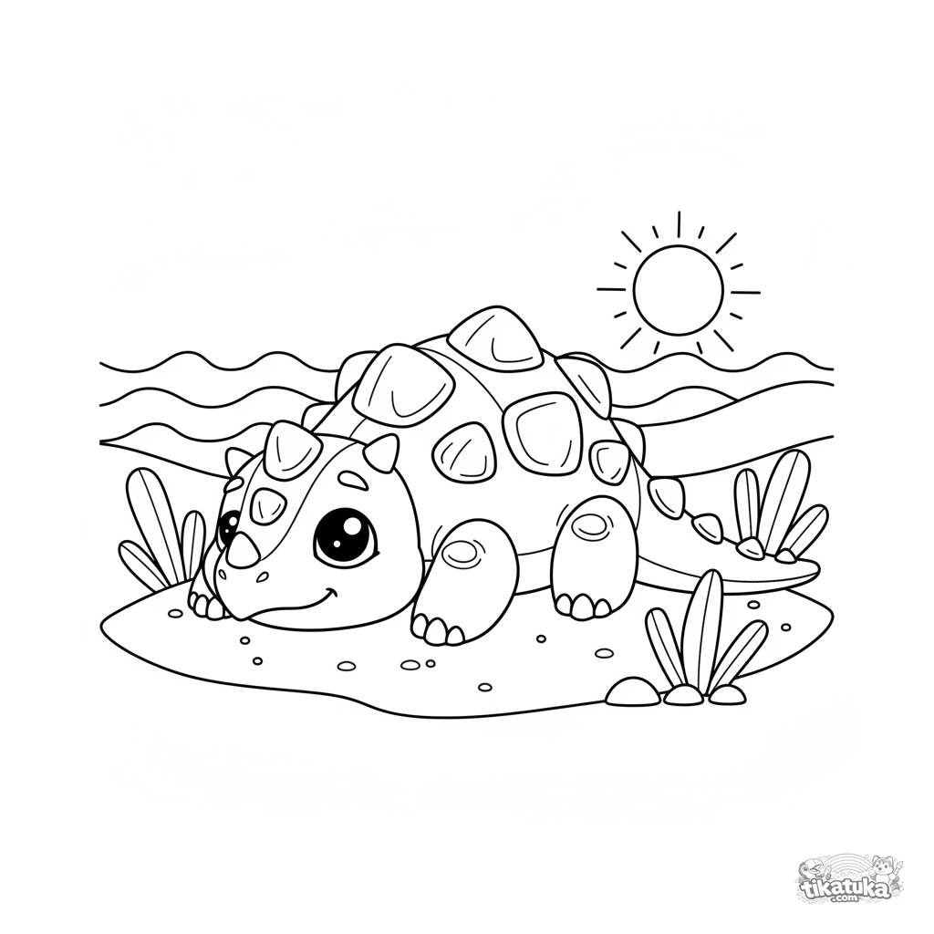 Página para colorir para crianças de 4-6 anos: um anquilossauro tomando sol em dunas de areia de uma costa antiga.