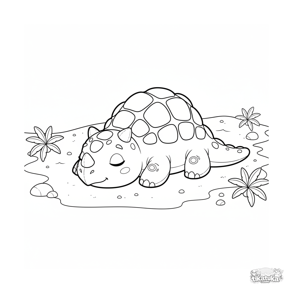 Página para colorir de um anquilossauro aconchegante tomando sol na areia quente de uma praia antiga. Para crianças de 4 a 6 anos.