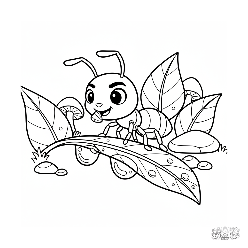 Página para colorir dinâmica para pré-adolescentes: uma formiga cruza corajosamente uma ponte frágil de duas gotas de orvalho em uma folha. Estilo quadrinhos-aventura.