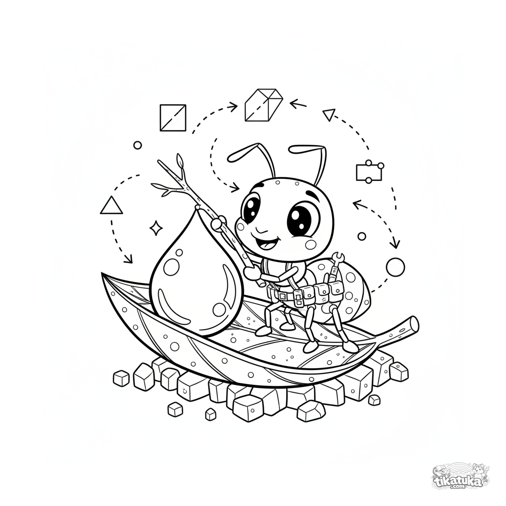 Página para colorir intrincada para crianças maiores 10-12: uma formiga engenheira em estilo de planta técnica conserta um reservatório de orvalho. Esquemas, ferramentas e detalhes.