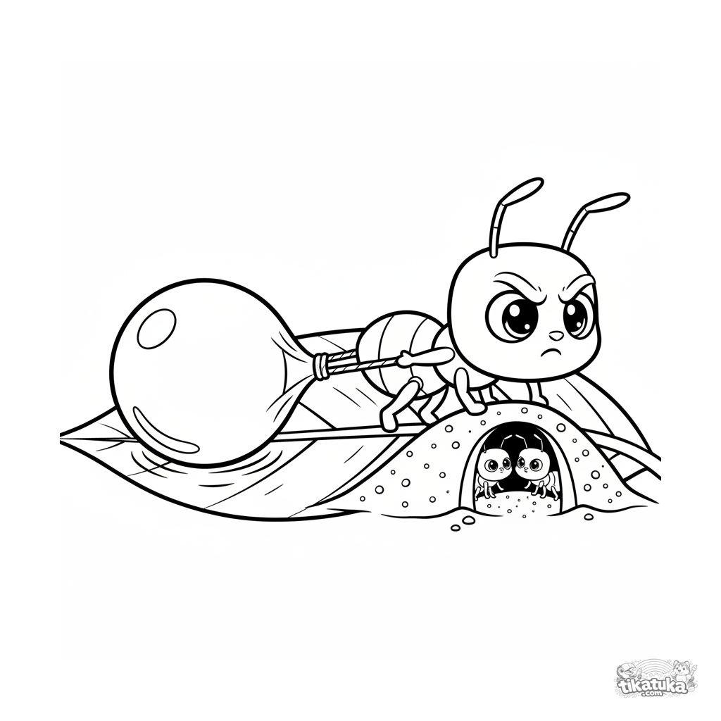 Página para colorir para crianças de 7-9 anos: uma formiga em pose dinâmica se esforça para puxar uma grande gota de orvalho para seu formigueiro na base da folha. Cena de estilo de história em quadrinhos.