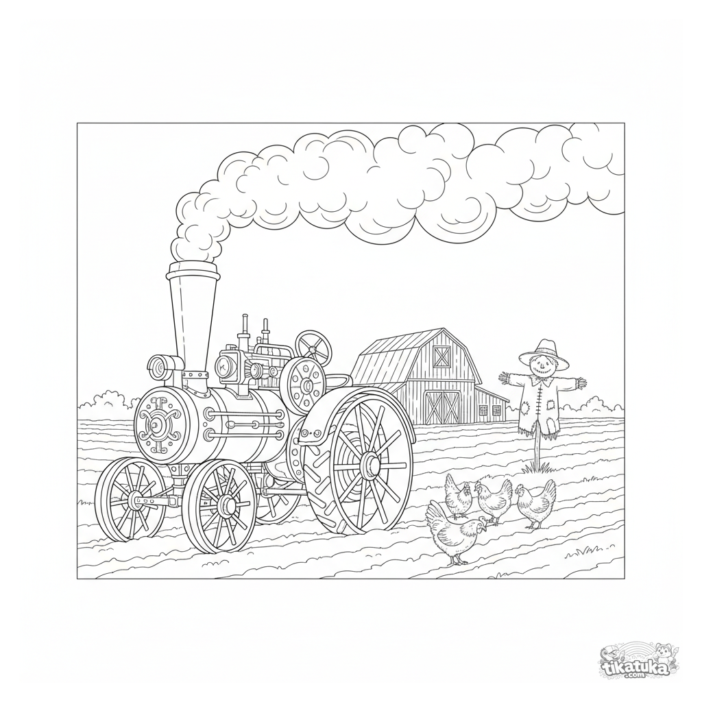 Página para colorir detalhada de um trator a vapor antigo arando um campo. Para meninos de 8 a 12 anos. Estilo realista.