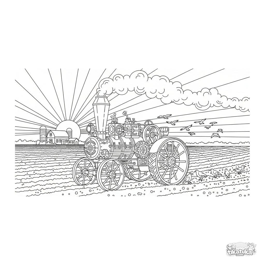 Página para colorir de um trator a vapor antigo e detalhado arando um campo ao pôr do sol. Cena realista e desafiadora para crianças de 8-12 anos.