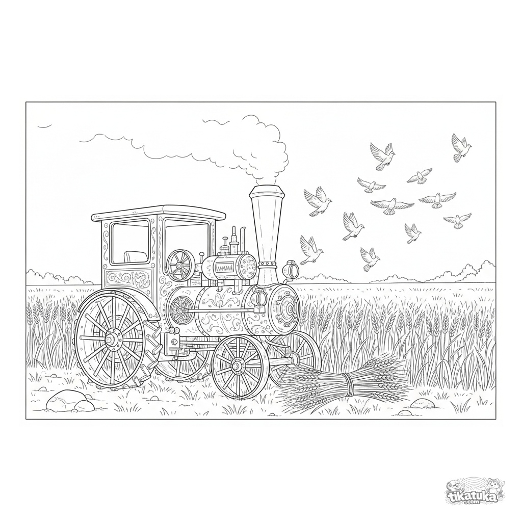 Página para colorir de um trator a vapor antigo detalhado estacionado na beira de um campo de trigo dourado. Para crianças de 8 a 12 anos.
