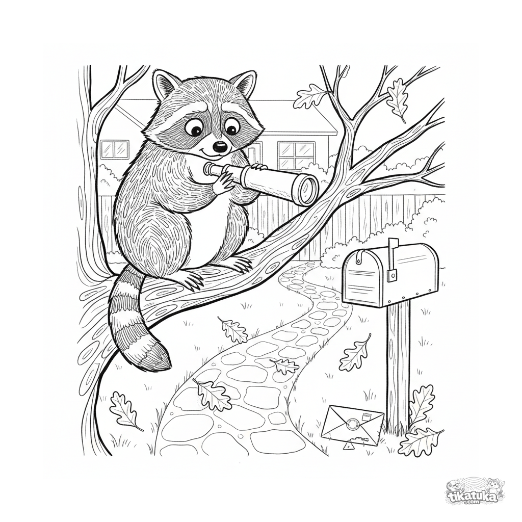 Página para colorir detalhada para crianças de 10-12 anos: um guaxinim ansioso com luneta em uma árvore observa uma caixa de correio, esperando o dia do pagamento. Cena no estilo esboço-aquarela.