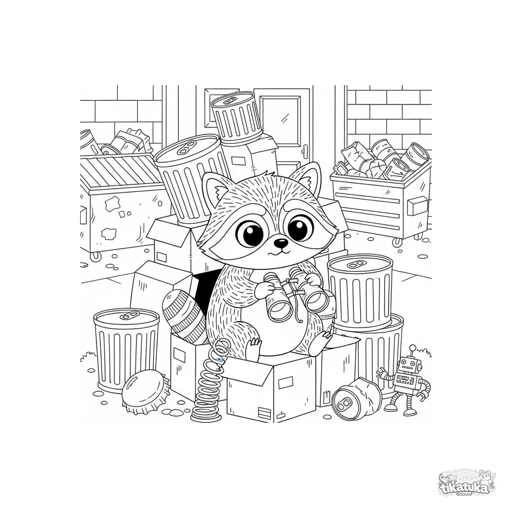 Página para colorir para crianças 10-12: um guaxinim ansioso com binóculos caseiros espreita de um forte de lixo, observando uma entrega. Cena engraçada detalhada com estilo doodle.