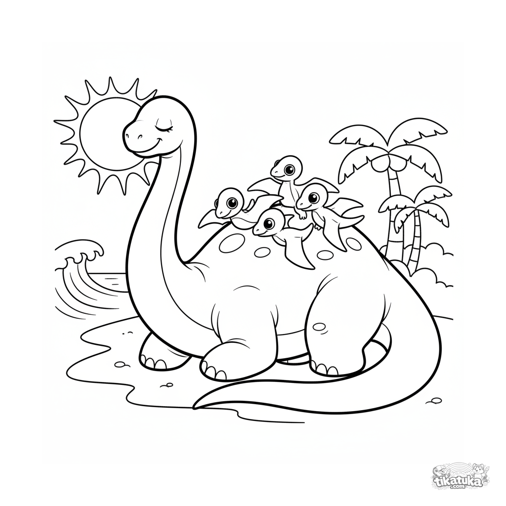Página para colorir para crianças 4-6: um apatossauro gigante dorme pacificamente ao sol em uma praia de areia antiga. Cena suave e aconchegante com pequenos pterossauros em suas costas.