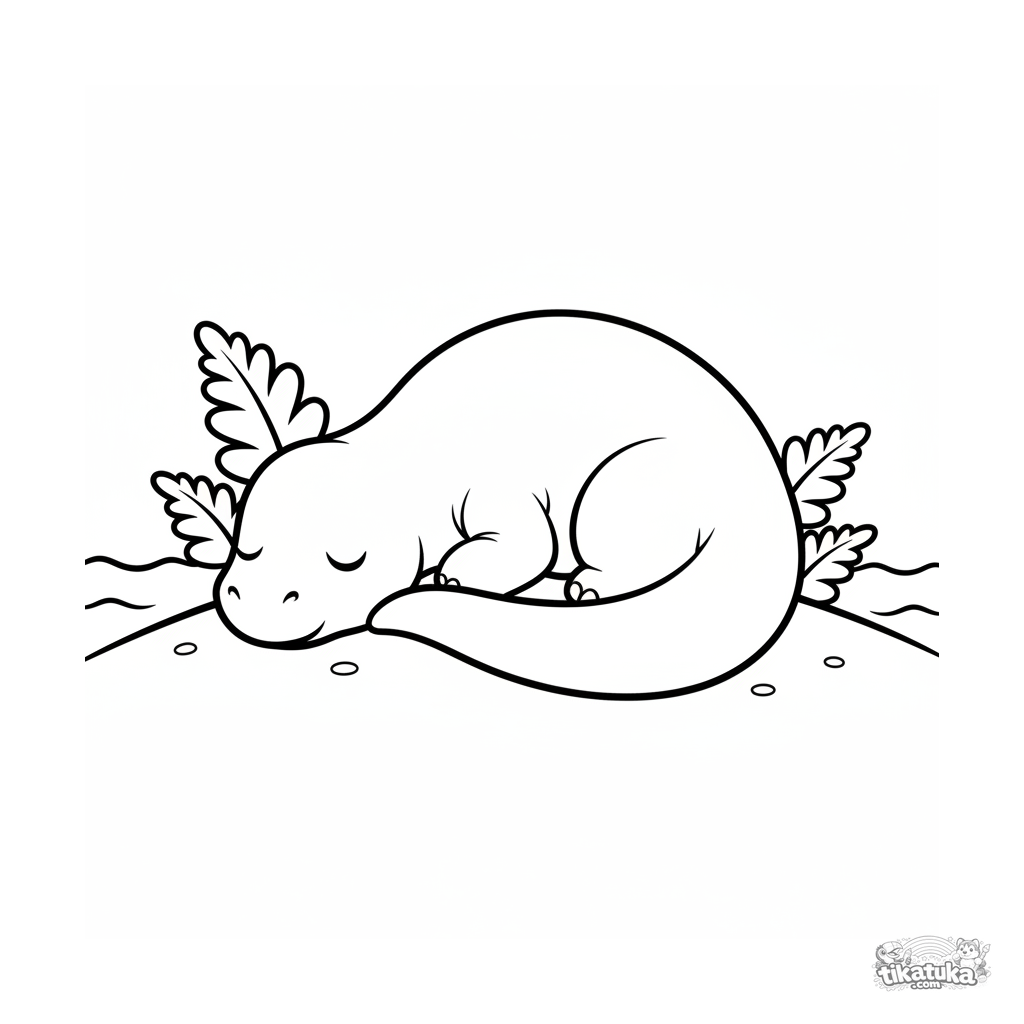 Página muito simples para colorir para crianças pequenas 2-3: um enorme apatossauro dorme encolhido em uma duna de areia. Formas enormes e claras.