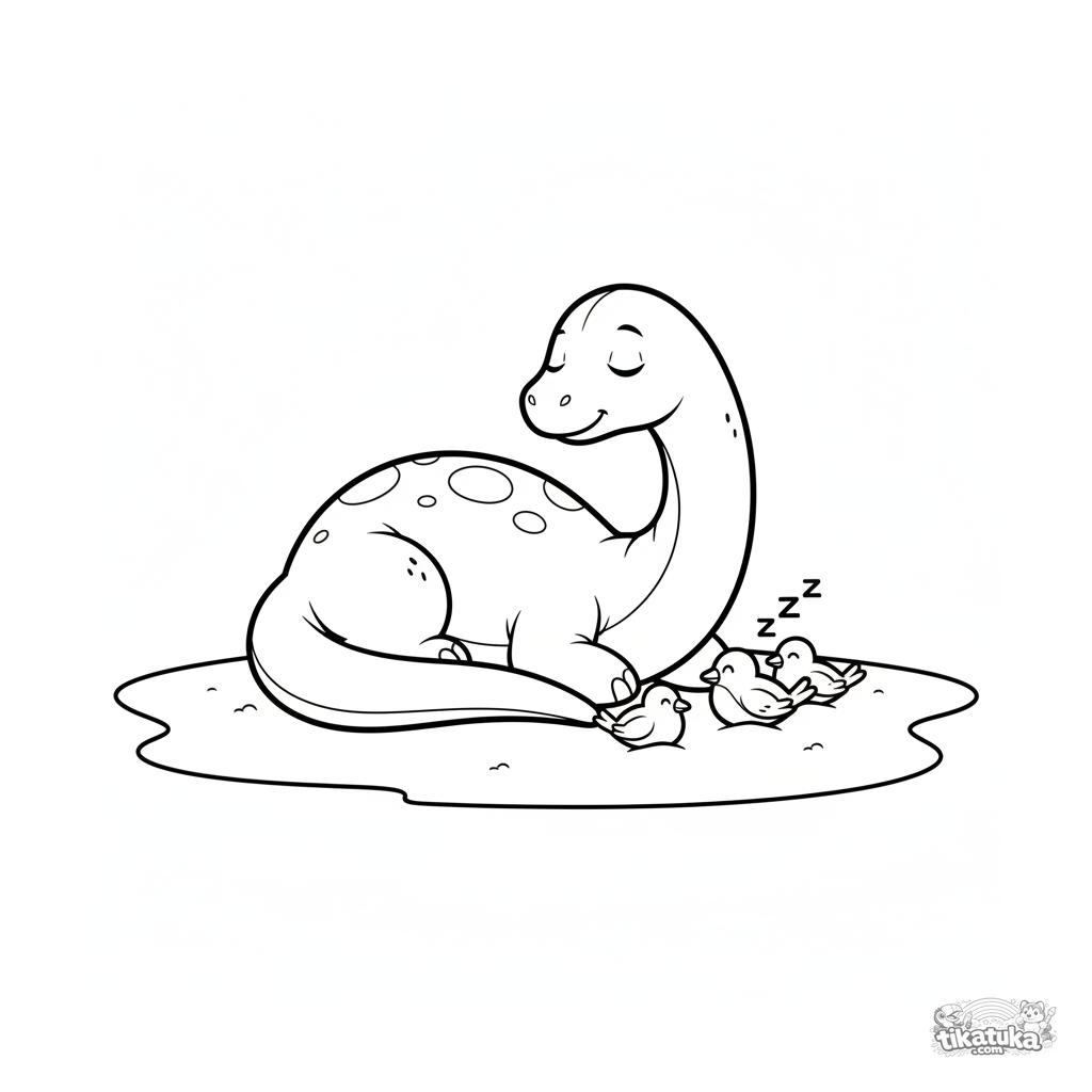 Página muito simples para colorir para bebês de 2-3 anos: um grande e amigável apatossauro dorme profundamente na areia quente de uma praia antiga. Formas grandes fechadas.